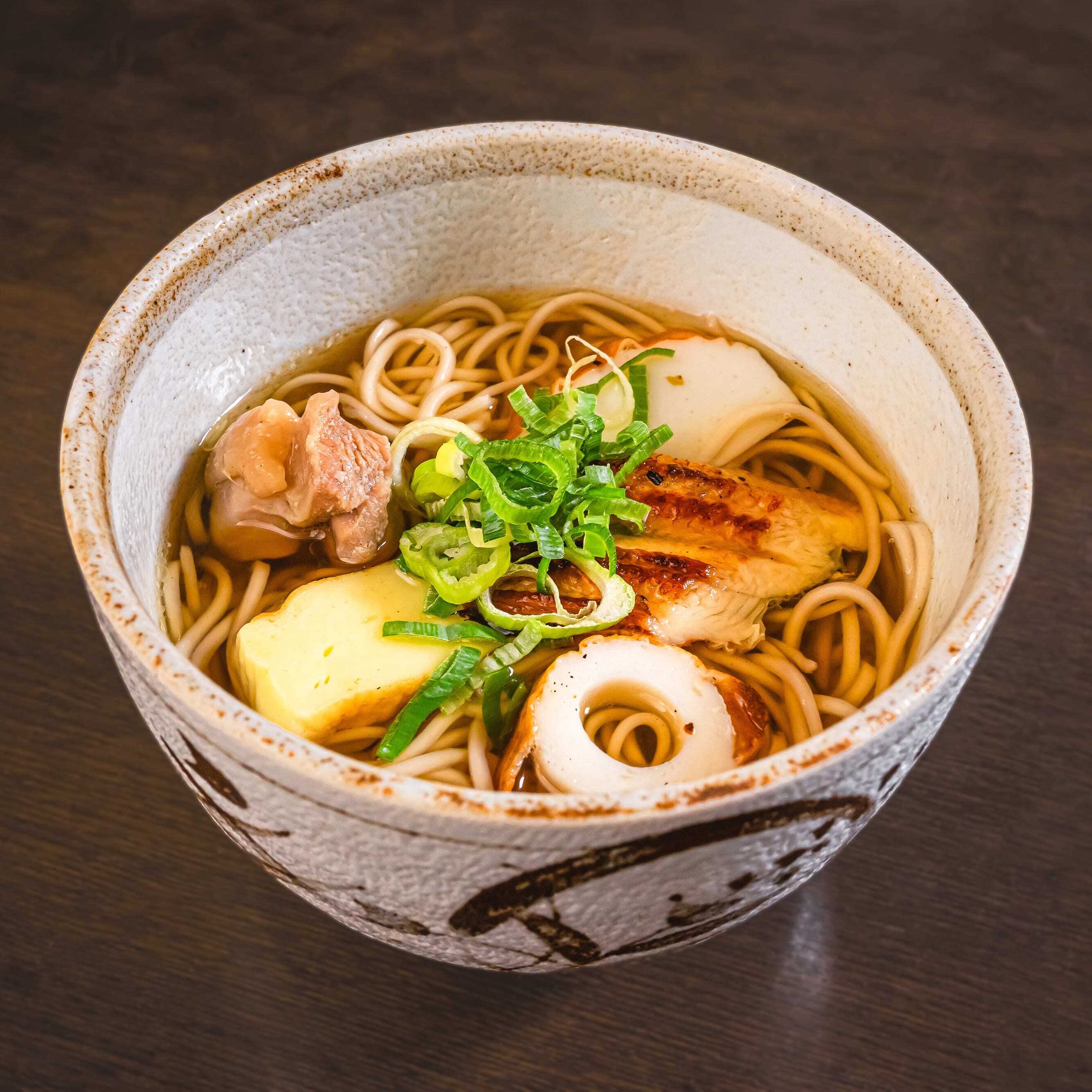 縁起の良い5種の具材が入った伝統の年越しそばをお楽しみください